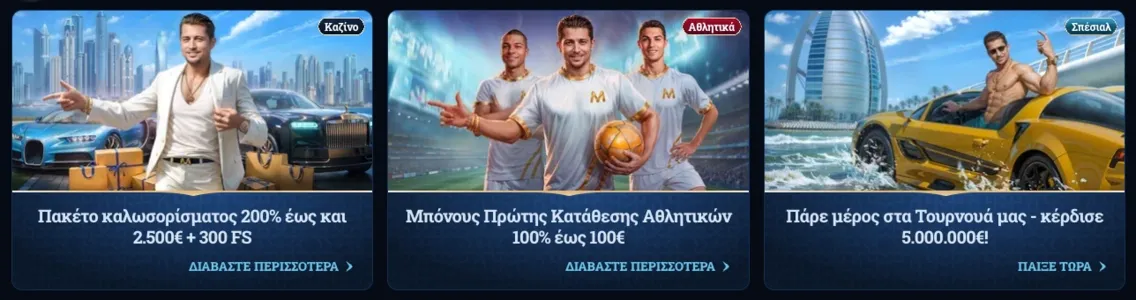 Στο Millioner, θέλουμε να αξιοποιήσετε στο έπακρο την εμπειρία στοιχημάτων σας. Υπάρχει μεγάλη ποικιλία μπόνους που απευθύνονται σε νέους χρήστες και υπάρχοντες παίκτες στις ενότητες καζίνο και αθλητικών στοιχημάτων. Οι παίκτες καζίνο μπορούν να διεκδικήσουν δωρεάν περιστροφές, ανταμοιβές επαναφόρτωσης και καθημερινές προσφορές που ισχύουν για κουλοχέρηδες, ζωντανά τραπέζια και τίτλους jackpot. Οι αθλητικοί στοιχηματιστές έχουν πρόσβαση σε αυξημένες αποδόσεις, επιστροφές χρημάτων από απώλειες και ειδικές προσφορές αγώνων.