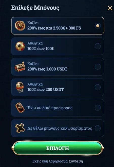 - Μπόνους Καλωσορίσματος Καζίνο: 250% έως 2.500 € + 300 Δωρεάν Περιστροφές